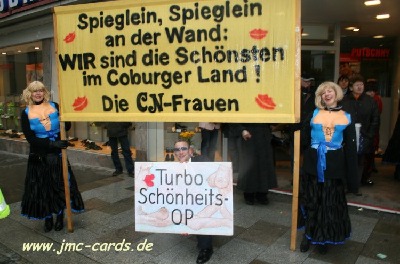 Jeder CN-Button (egal ob "Niete" oder Hauptgewinn) vom Gaudiwurm in Coburg kann, wie in der Tagespresse angekündigt, ab sofort bei einem Vertriebspartner Ihrer Wahl gegen eine Ansichtskarte von jmc cards eingetauscht werden. Zeit dafür haben Sie genug: bis zum 11.11.2008, dem Beginn der nächsten Faschings-Saison.